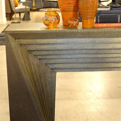 The Deco Console is handcrafted in hardwood with hand-applied and textured brass sheeting finished with antique wash.