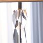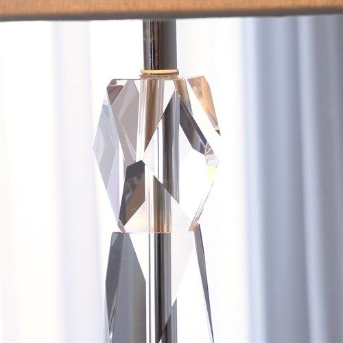 Roger Thomas has collected eccentric faceted rock crystal shapes for 20 years. Stacking them in a delightful column was the inspiration for this design. White marble base and hardback fabric shade.