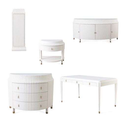 A study in feminine form and artistic details, our Fountain Collection is classically chic and elegantly modern all at once. Gracious proportions, gorgeous fluting in a soft ivory finish, honed marble tops and hand cast brass pulls make this collection one of Ashley’s favorites.