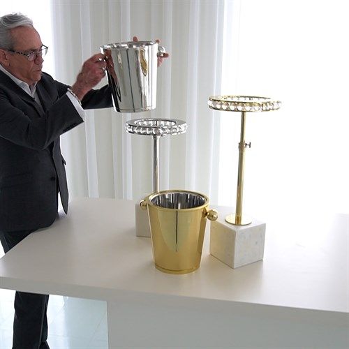 A sleek brass finish paired with a unique profile accentuated by the ball shaped handles gives stylish function to this elegant ice bucket. With a removable stainless-steel insert, the Margot Bucket gleams beautifully atop our gorgeous Margot Side Table.